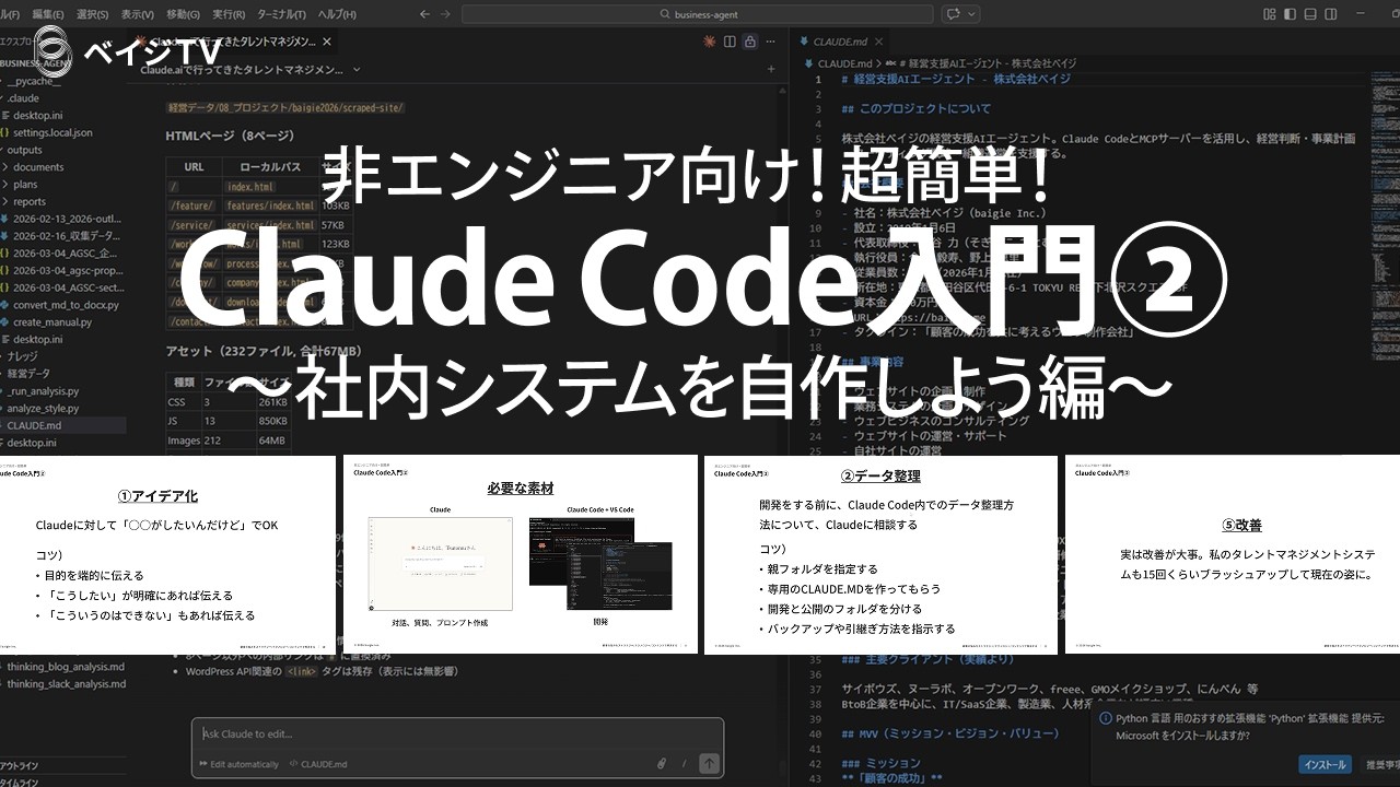 超入門講座の第二弾。枌谷氏がClaude Codeで作った社内タレントマネジメントシステムを例に、技術用語を使わずわかりやすく紹介した実演動画。